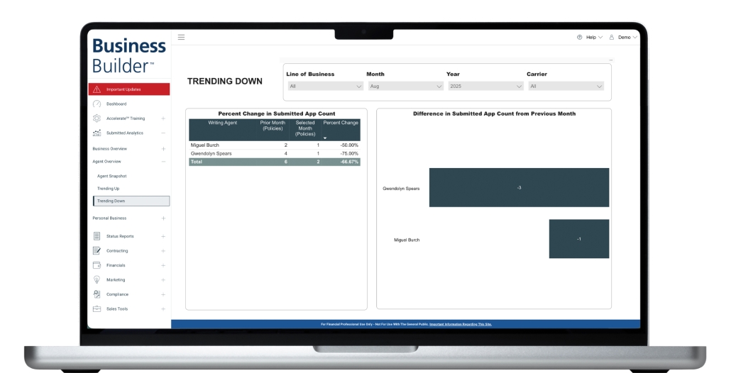 With the power of Business Builder, managing your agency and your downline has never been easier. Business Builder uses the power of real-time analytics to put valuable insights into your agency at your fingertips so you can make smarter, data-driven decisions. Plus, you’ll work with a dedicated case manager to assist you, your agents, and your internal staff.